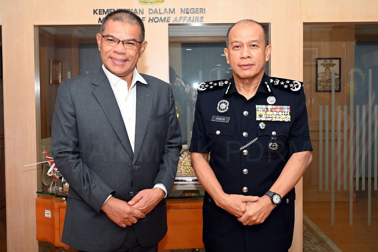 Ketua Polis Negara (KPN), IG Dato’ Sri Hj. Mohd Khalid Hj. Ismail hari ini telah mengadakan kunjungan hormat ke atas Menteri Dalam Negeri (MDN), Datuk Seri Saifuddin Nasution Ismail di pejabat rasminya di Kementerian Dalam Negeri tengah hari tadi.