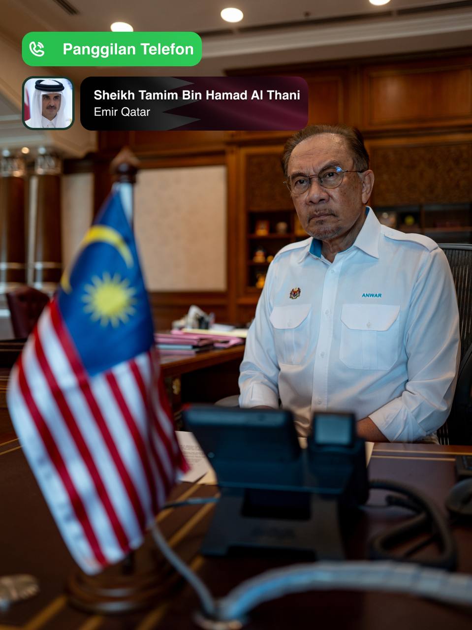 YAB Perdana Menteri Dato’ Sri Anwar Ibrahim menghubungi Emir Qatar, Yang Amat Mulia Sheikh Tamim Bin Hamad Al Thani petang semalam bagi merakamkan penghargaan atas peranan penting beliau dalam memeterai gencatan senjata antara Iran, Israel dan Amerika Syarikat.