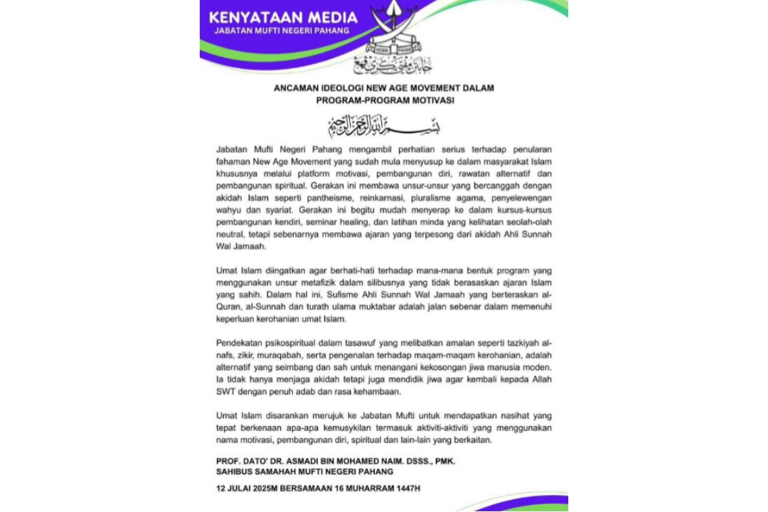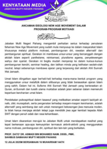 Jabatan Mufti Negeri Pahang mengambil perhatian serius terhadap penularan fahaman New Age Movement yang sudah mula menyusup ke dalam masyarakat Islam khususnya melalui platform motivasi, pembangunan diri, rawatan alternatif dan pembangunan spiritual.