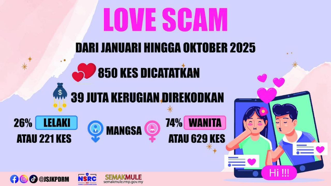 Berhati-hati dengan sindiket penipuan jenis “love scam”, di mana penipu menggunakan identiti palsu untuk mendapatkan kepercayaan dan kasih sayang mangsa sebelum menuntut wang. Penipu lazimnya mengelak pertemuan fizikal atau panggilan video yang mendakwa bekerja di luar negara dan meminta wang atas alasan kecemasan, hadiah tersekat di kastam, atau projek perniagaan.