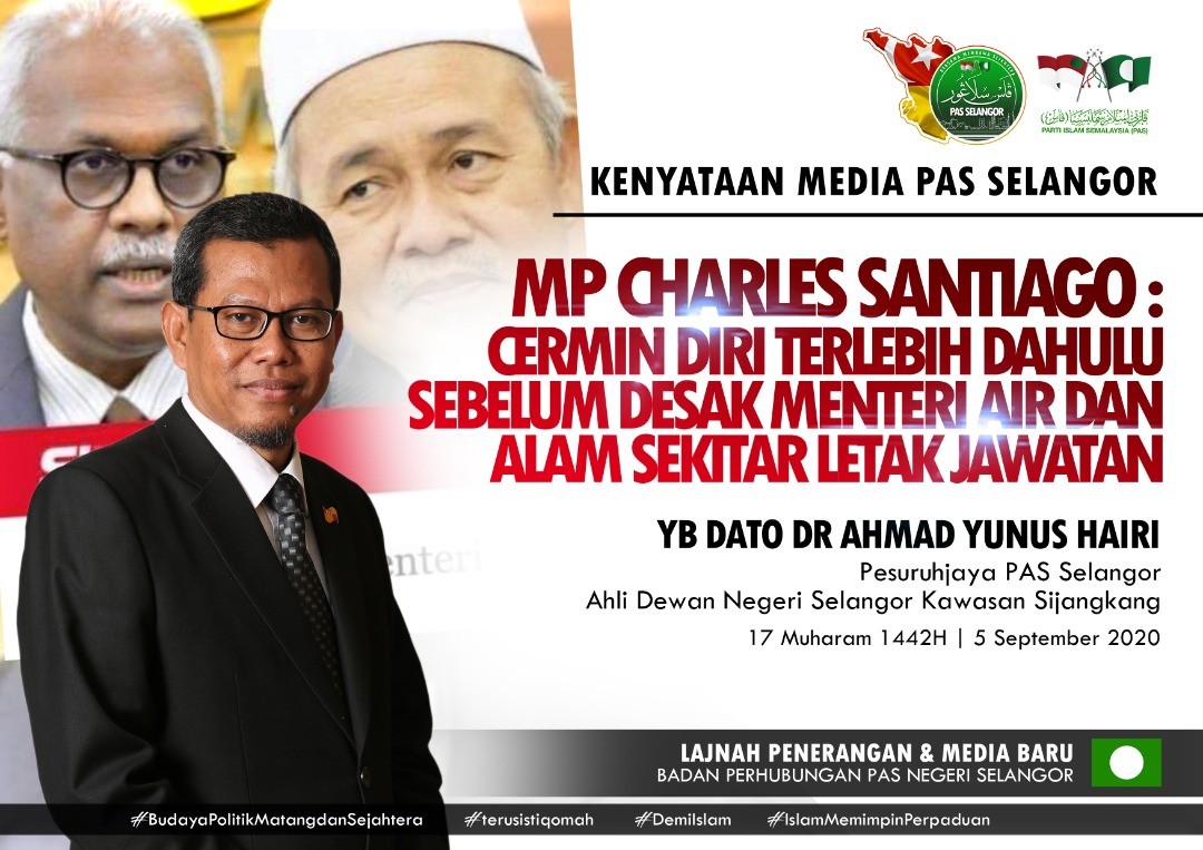 Badan Perhubungan PAS Negeri Selangor meminta YB Charles Santiago cermin diri terlebih dahulu sebelum menuding kesalahan dan meminta YB Dato Sri Tuan Ibrahim Tuan Man, Menteri Air dan Alam Sekitar meletakkan jawatan jika gagal mengambil tindakan terhadap syarikat yang menyebabkan pencemaran Sungai Selangor dalam tempoh sebulan.
